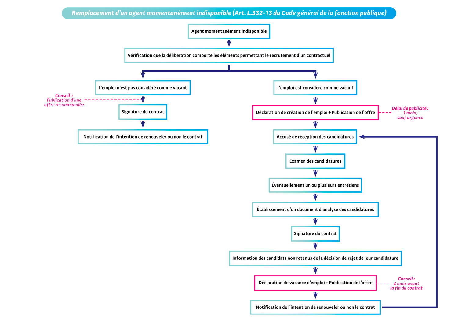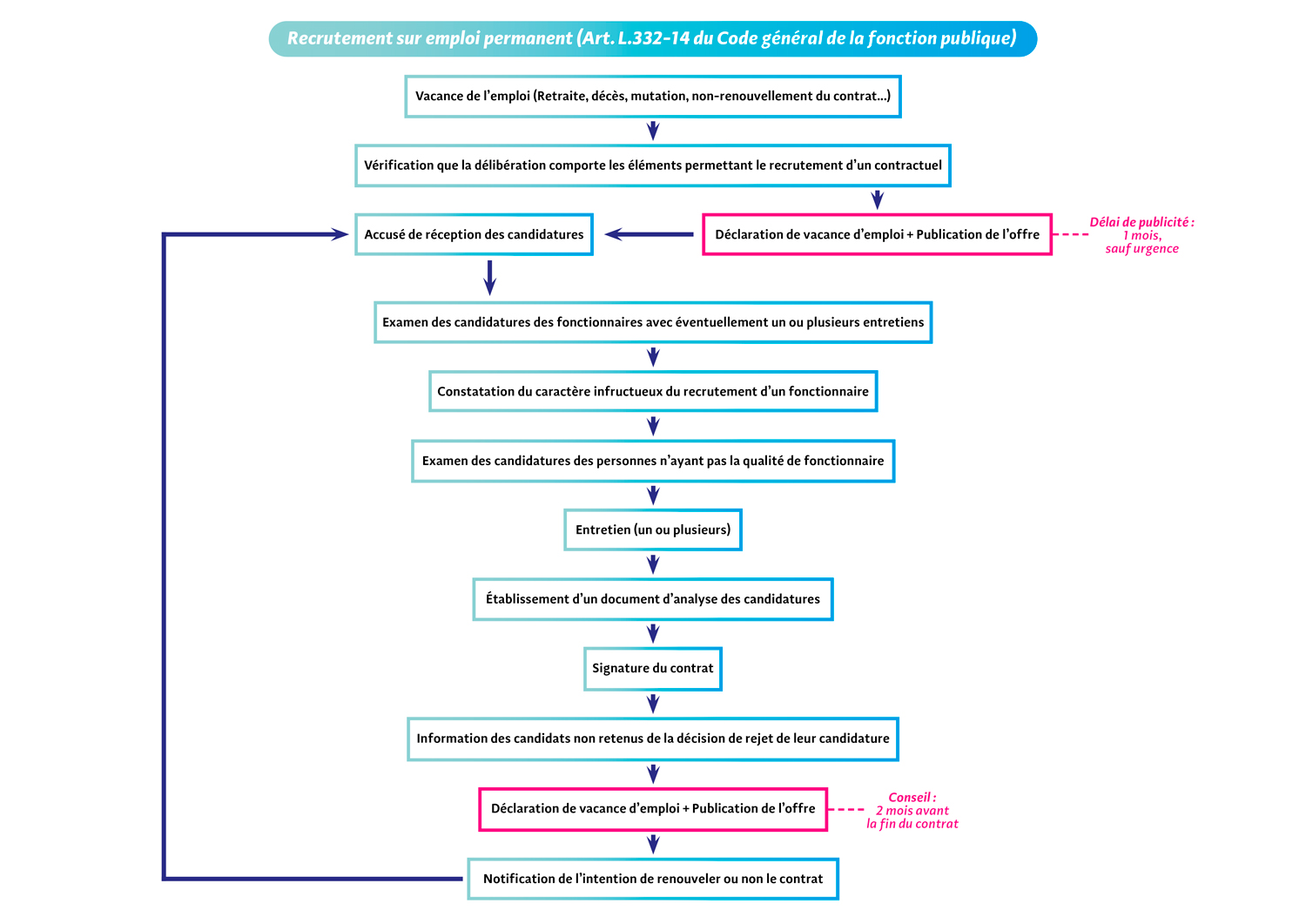 Nota : le décret n° 2019-1414 du 19 décembre 2019 relatif à la procédure de recrutement pour pourvoir les emplois permanents de la fonction publique ouverts aux agents contractuels précise les conditions et procédures de recrutements des agents contractuels sur ces emplois permanents vacants.