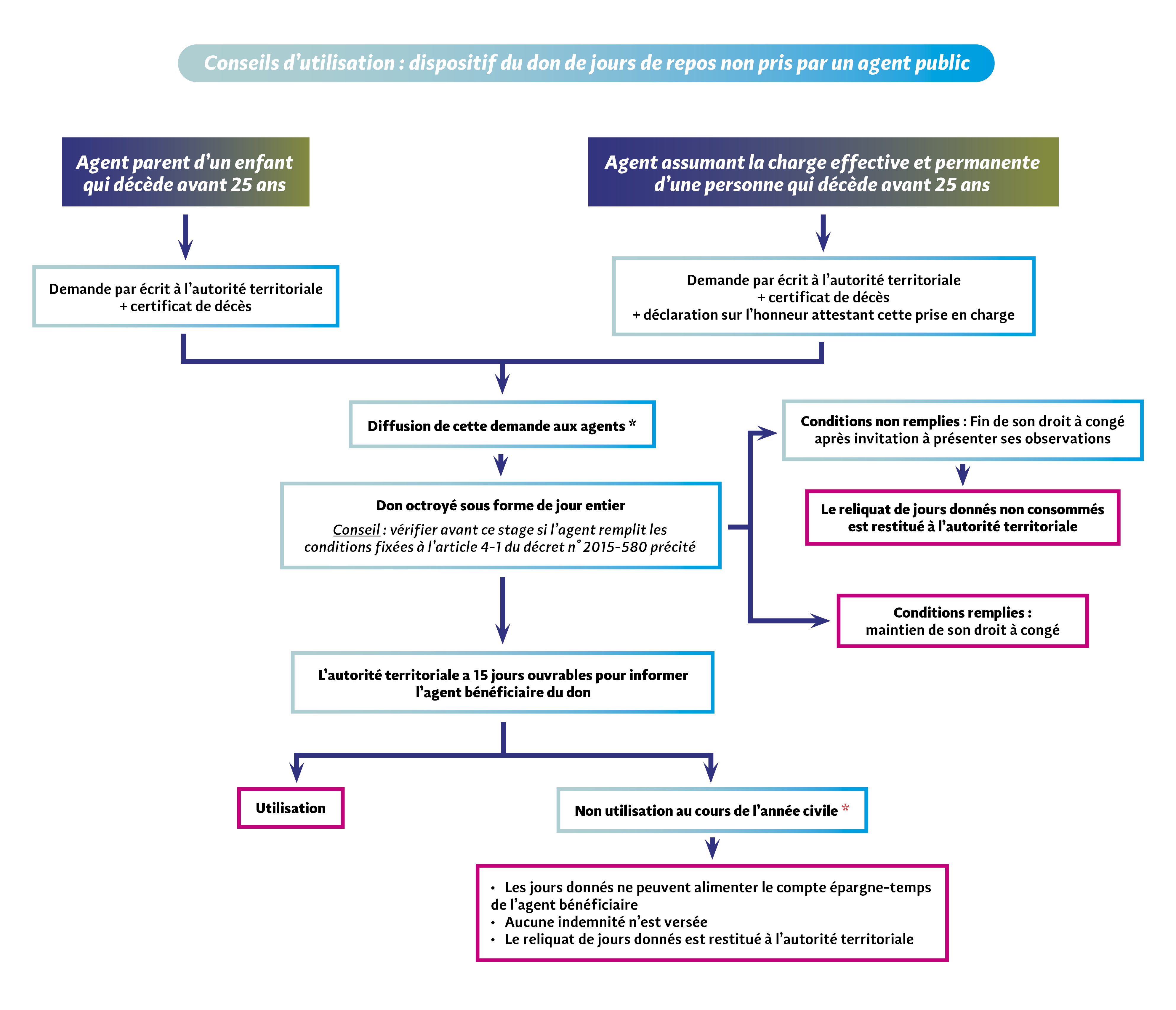 Conseil : pour éviter que le reliquat de jours donnés mais non consommés par l'agent bénéficiaire au cours de l'année civile soit restitué à l'autorité territoriale, nous vous conseillons, pour les évènements survenus en fin d'année, de diviser le don en 2 parties :