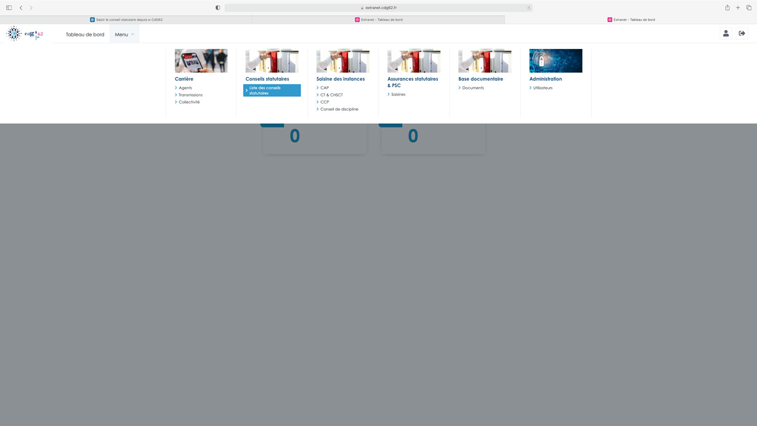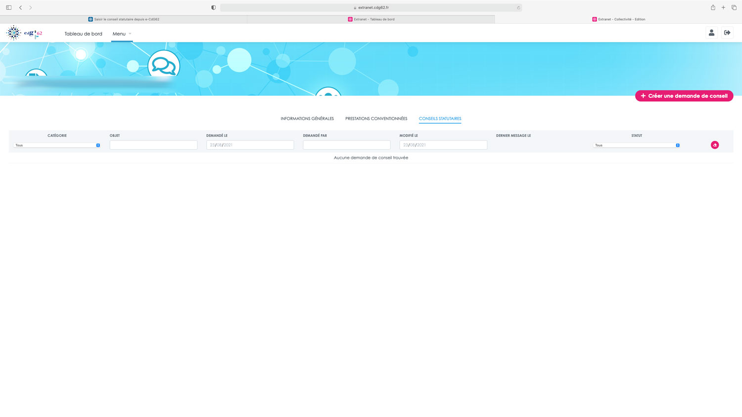 Le menu du haut comporte en effet un onglet « Conseils statutaires » dans lequel vous retrouvez la « Liste des conseils statutaires ». C’est dans cette partie que vous pouvez voir le suivi de vos demandes mais également déposer vos nouvelles demandes.