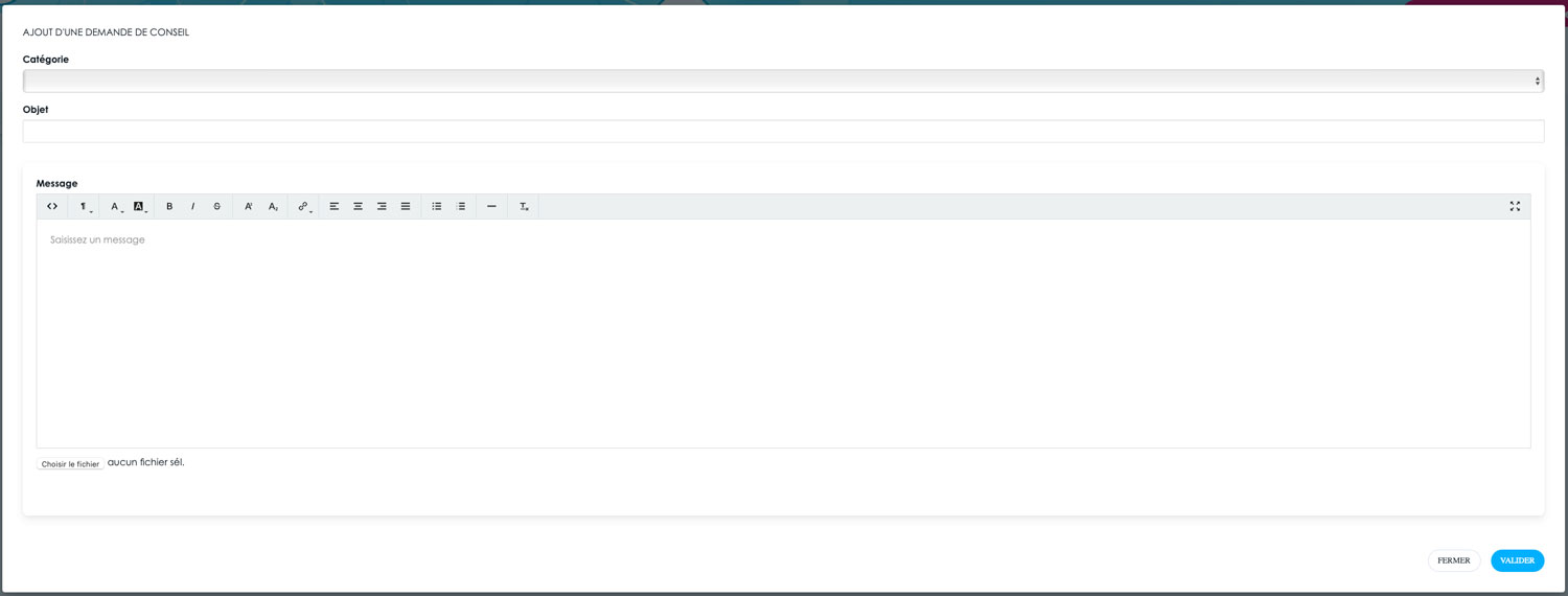 Vous rédigez ensuite votre question dans la partie « Message » et vous pouvez également ajouter une pièce jointe à l’aide du bouton prévu à cet effet. N’oubliez pas de finaliser votre demande en cliquant sur « Valider ».